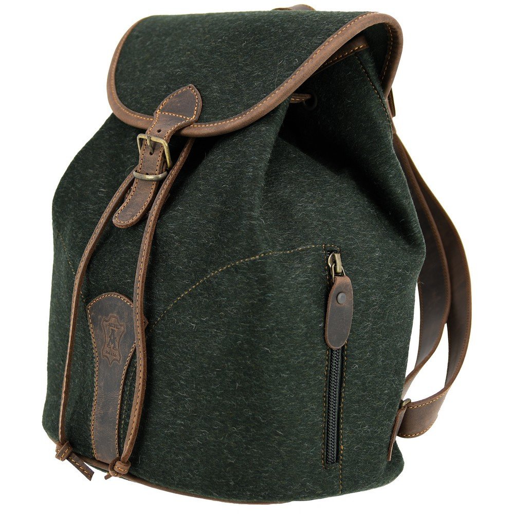 Rucksack aus loden und wasserfestem Rindsleder mit Nubuk-Effekt. Futter aus waschbarem und luftdurchlässigem Stoff. Zwei Vordertaschen, Innentasche mit Reißverschluss und regulierbare Riemen.